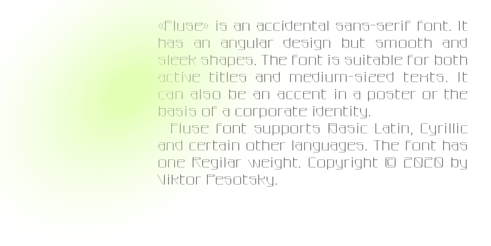 Fluse — it has a grotesque design, but with a contrast of strokes. The font is asymmetric vertically, and stretched up, and all the corners are rounded. There is also a limited set of graphic techniques, so it is very smooth in typing, and looks technological, thanks to rectangular shapes and diagonals. In the mood, this is naive futurism, like from the films of the 80s about the future.